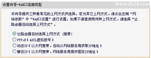 4、选择上网方式:家庭用户大多数是“PPPOE(ADSL虚拟拨号)”的上网方式,如果你不清楚自己的上网方式可以选择第一项“让路由器自动选择上网方式(推荐)”------>“下一步”。