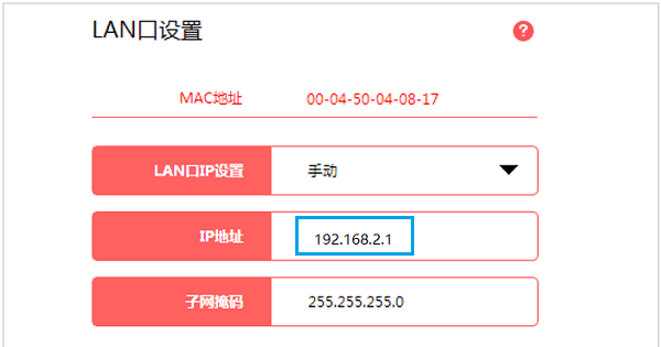 3、登录到水星路由器设置界面后,找到“LAN口设置”选项,把IP地址修改为:192.168.2.1,并保存。