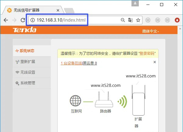 然后在浏览器中输入这个ip地址,就可以打开你的腾达放大器(扩展器)的设置界面了。